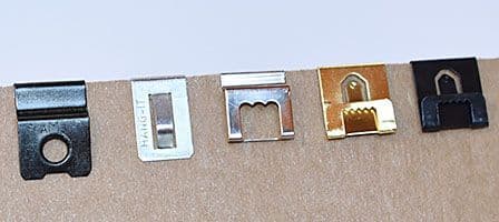 A set of picture hangers that can slide over the backing board of a picture frame. Including clip over hangers, pozi hangers, friction hangers and 'hang-it' picture hangers. Some hangers are designed for 2mm board and others are designed for 3mm board and others can fit over both. Picture frame backing board is usually MDF or a similar material.
